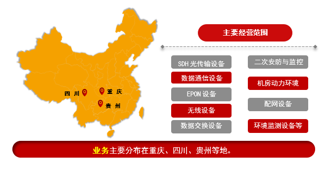 重庆合晨电通科技有限公司主要经营范围涵盖了SDH光传输设备、数据通信设备、EPON设备、无线设备、通信光缆及金具、二次安防与监控设备、机房动力环境设备、配网设备、环境监测设备等产品,业务主要分布在重庆、四川、贵州等地。以下为部分典型业绩: